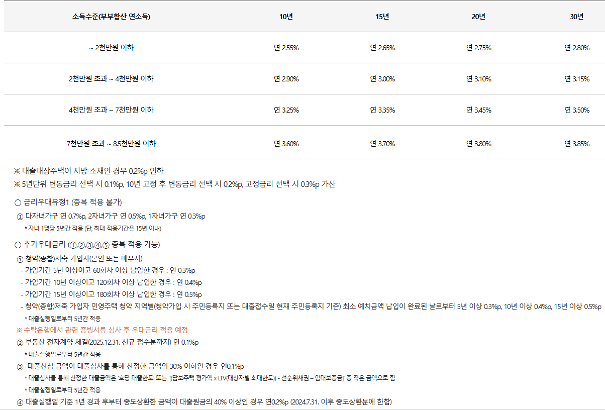 표를 보시면 쉽게 소득에 따른 연 금리가 보이실 겁니다. 소득 수준은 부부합산 연소득입니다.